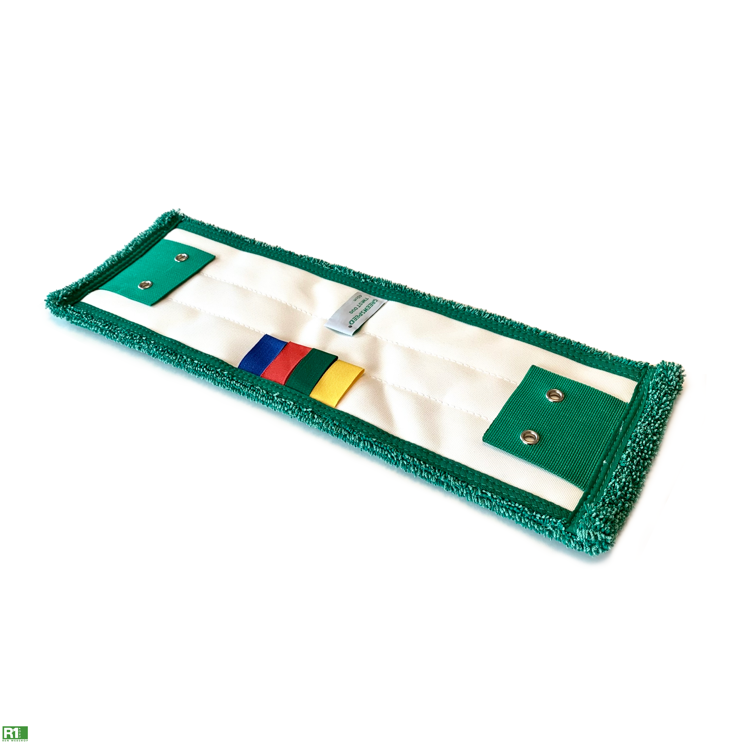 Fladmoppe i mikrofiber. Til fugtig rengøring af overflader. Inkluderer to flapper med huller til montering.